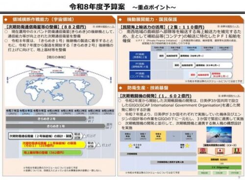 ​​日本は自国で装備品を開発・購入するだけでなく、法改正により、外貨獲得のために自国装備品の輸出制限も緩和している。 2026年度予算案には、英国及びイタリアとの2035年就役予定の次世代戦闘機開発協力、並びに両国とのAI搭載ドローン開発のための1600億円が盛り込まれている。