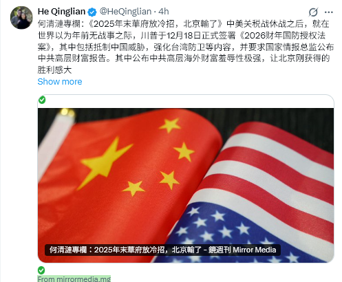 何清漣コラム:「2025年末にワシントンが狡猾な一手を打つ、北京は敗北」 米中関税戦争の休戦後、世界が年末までに戦争は起きないと踏んでいた矢先、トランプ大統領は12/18に「2026会計年度国防権限法」に正式に署名した。この法律には、中国の脅威に対抗し、台湾の防衛力を強化するための条項が含まれており、国家情報長官に中共高官の資産に関する報告書の公表を義務付けている。中共高官の海外資産の公表は極めて屈辱的であり、北京の勝利感を大きく損なうものだ。