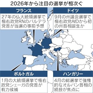 【ベルリン=南毅郎、パリ=北松円香】2026年は欧州の注目選挙で極右政党の躍進が鮮明になりそうだ。反ナチスが国是のドイツは9月の州議会選挙で初の極右の州首相誕生が現実味を帯びてきた。ウクライナの和平協議など外交課題が山積するなか、既存政党の退潮という内憂に直面する。