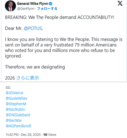 12/29The Gateway Pundit<Gen. Michael Flynn Issues Urgent Open Letter to President Trump — Says “We The People Demand ACCOUNTABILITY!”= マイケル・フリン将軍がトランプ大統領に緊急公開書簡を発出、「我々国民は説明責任を要求する!」>