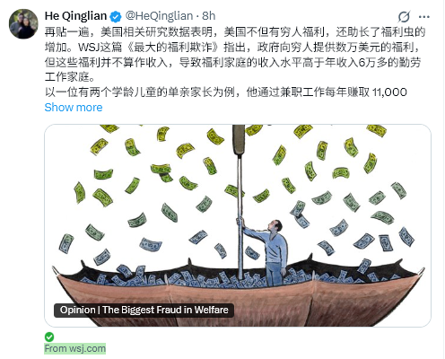 もう一度投稿するが、米国の関連調査データは、米国が貧困層に福利を提供するだけでなく、福利寄生虫の増加を助長していることを示している。このWSJの記事「最大の福利詐欺」は、政府が貧困層に数万ドルの福利給付を提供しているにもかかわらず、これらの給付が収入として計上されていないため、福利受給者の収入水準は年間6万ドル以上を稼ぐ勤労家庭よりも高いと指摘している。