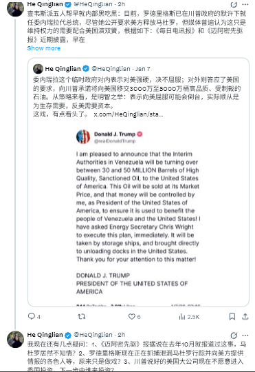 WSJは5日、独占報道を掲載し、関係筋によると、最近の米情報機関の機密評価では、マドゥロが権力を失った場合、ロドリゲス副大統領を含む政権幹部が暫定政権を率いて短期的な安定を維持するのに最も適任であると結論付けられたと報じた。