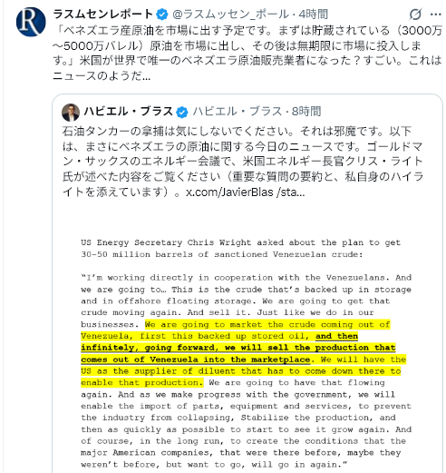 ベネズエラ暫定政府は、国内向けに米国に対して強硬な姿勢を表明し、決して屈服しないと誓っている。しかし、対外的には米国の要求を受け入れ、トランプ大統領に対し、制裁対象の高品質原油3,000万~5,000万バレルを米国に引き渡すことを約束している。戦略的には、これは賢明な動きと言える。表向きで米国に服従すればクーデターにつながるかもしれないが、実際には従順さは生き残るための必須条件であり、反米主義には資本が必要だ。