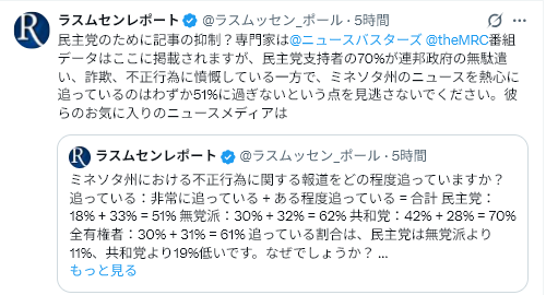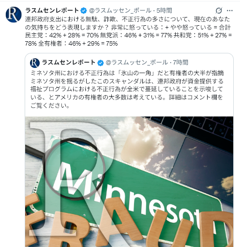 1/7Rasmussen Reports<Minnesota ‘Tip of the Iceberg’ for Fraud, Most Voters Say=ミネソタ州における詐欺は「氷山の一角」、有権者の大半が指摘>