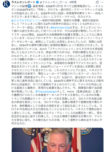 まだいくつか疑問がある。1. マイアミ・ヘラルド紙は昨年10月という早い時期にこれを報じていたのに、マドゥロがそれを知らなかったはずがない。2. ロドリゲスは現在、マドゥロの居場所をリークし、米国に情報を提供した複数の人物を逮捕している。これは全てシナリオ通りだったのだろうか?3. トランプ大統領は大手米企業がベネズエラに投資すると約束したが、今では彼らはそれに応じようとしない。次に投資するのは誰だろうか?