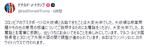 今日のビッグニュース:コロンビアの左派大統領グスタボ・ペトロ米国のトランプ大統領の関係は、激しい摩擦の時期を経て劇的な展開を見せている。