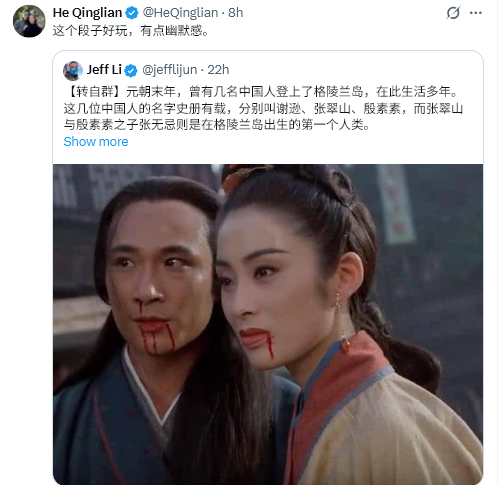 [グループから転載] 元朝末期、数人の中国人がグリーンランドに上陸し、長年そこで暮らした。これらの中国人の名前は歴史書に記録されている。謝遜、張翠山、殷素素である。張翠山と殷素素の息子、張無忌は、グリーンランドで生まれた最初の人間である。