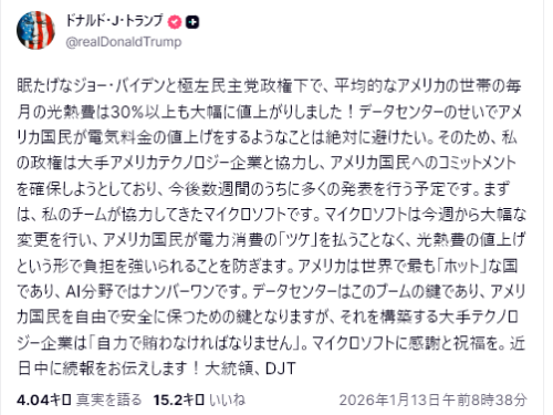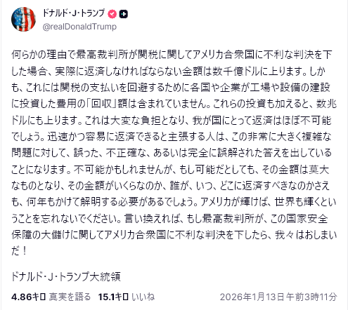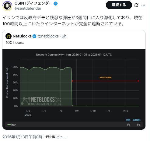 そして、その投稿の翌日には、ベネズエラを攻撃し、マドゥロ大統領を連行しました。トランプ大統領の発言は常に虚々実々ですが、ベネズエラを攻撃したことで、前日のSNSは強烈な印象を放つことになりました。今回の抗議行動発生は、12月28日でしたが、1月2日のこの発言を受け、デモが激化しています。