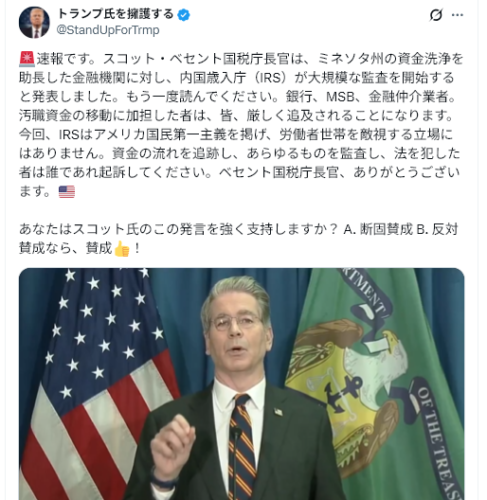 「スコット・ベセント国税庁長官」は「スコット・ベセント財務長官兼IRS長官代理」の誤り。
