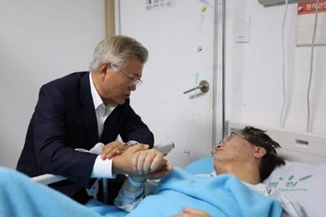 2023年9月19日、福島第一原発の処理水放出に抗議して断食パフォーマンスを断行した「共に民主党」の李在明代表(当時)は、その後体調を崩し入院。そんな李氏を前大統領の文在寅氏が見舞いに訪れた(写真:Yonhap News Agency/共同通信イメージズ)