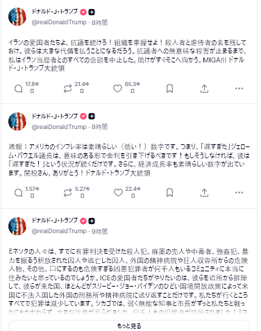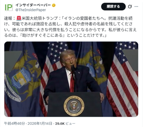 イランが平和的な抗議者を銃撃し、暴力的に殺害するならば(それが彼らの常套手段です)、米国は彼らを救出します。我々は準備万端で、いつでも出動できます。この件にご関心をお寄せいただきありがとうございます!ドナルド・J・トランプ大統領