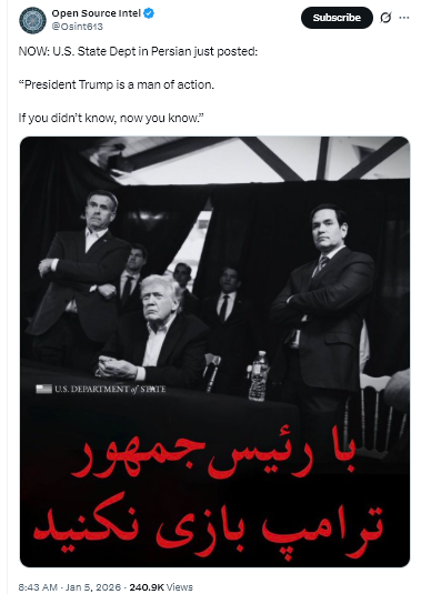 2日後の1月4日、トランプ大統領は国務省でペルシャ語で別のメッセージを伝えた。