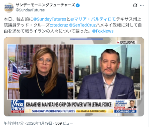 「現在、100万人以上のイラン人が信じられないほどの勇気を示し、この暴君的な政権に立ち向かっています。トランプ大統領は政権に対し、第一に、我々は国民と共にある、抗議者を標的にしたり殺害したりしてはいけない、抗議者に対して、米国はあなた方と共にある、と力強く伝えてきたと私は言わざるを得ません」とクルーズ氏は述べた。