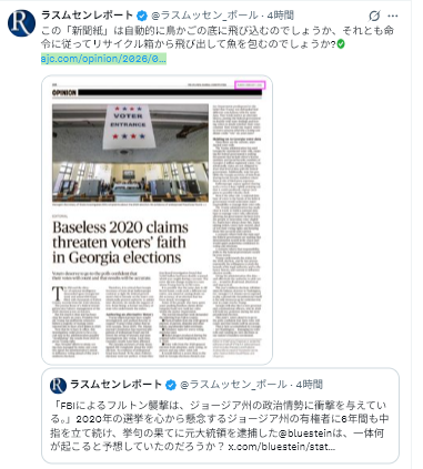 ウェルカー:不正があったとおっしゃっていますね。州および連邦選挙管理当局は、2020年の選挙は史上最も安全な選挙だったと評しています。ところで、今週ジョージア州で何が起こっているのかお聞きしたいのですが。FBI捜査官はフルトン郡の選挙センターで令状を執行し、2020年の選挙に関連する投票用紙と記録を押収しました。ジョージア州選出の民主党上院議員、ジョン・オソフ氏がこの捜索について何と発言したか、ぜひ聞いてください。トランプ大統領が2026年の中間選挙に介入しようとしている、ジョージア州でまさにそうしているという疑惑について、どうお考えですか?