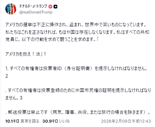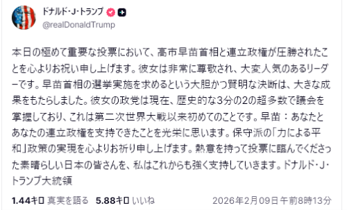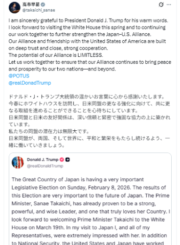英BBC放送(2月6日付)は投票日を前にドナルド・トランプ米大統領が公式な高市氏支持を表明したことを報じた。トランプ氏はSNSのトゥルース・ソーシャルで「彼女は日本国民を失望させない!」と太鼓判を押し、3月19日にホワイトハウスへ招待する意向も明らかにした。