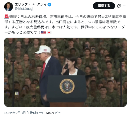 2/8The Gateway Pundit<Japan’s Trump-Endorsed ‘Iron Lady’ Scores Landslide Victory in Japan — Securing Mandate For Deeper U.S. Ties=トランプが支持する日本の「鉄の女」が日本で圧勝 ― 米国とのより深い関係構築の信任を確保>