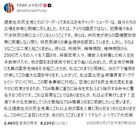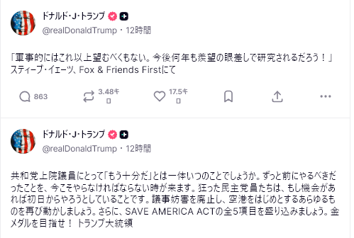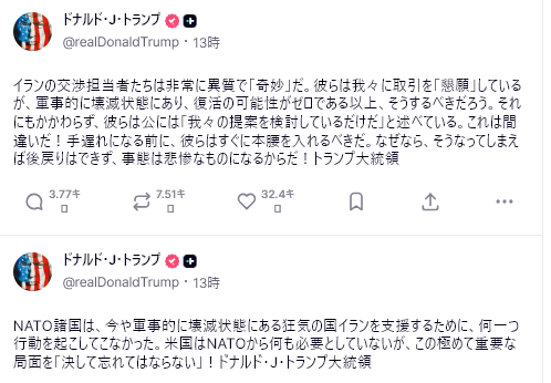 速報:トランプ大統領は、イランがひざまずいて許しを乞い、泣きながら合意を懇願していることを確認した。しかし、イラン側は殺されることを恐れて、公に立場を表明する勇気はない。