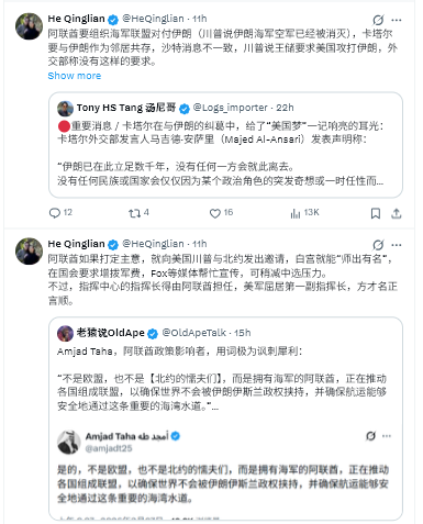 UAEはイランに対抗する海軍連合を組織しようとしている(トランプはイラン海軍と空軍が壊滅したと述べている)。カタールは隣国としてイランと共存したいと考えている。サウジアラビアの情報は不一致で、トランプはムハンマド・ビン・サルマン皇太子が米国にイラン攻撃を要請したと述べているが、外務省はそのような要請はしなかったと。