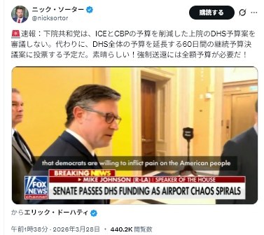 3/27The Gateway Pundit<HOUSE GOP STRIKES BACK: Furious Republicans Move to ADD ICE Funding and Voter ID to Senate’s DHS Garbage Deal With Democrats — Will Force ‘Cowardly Senators’ Back to D.C.=下院共和党が反撃:激怒した下院共和党は、上院民主党との国土安全保障省に関する不当な合意に、ICE(移民税関執行局)の予算と有権者ID制度を追加する動きを見せ、「臆病な上院議員」をワシントンD.C.に戻すと表明>