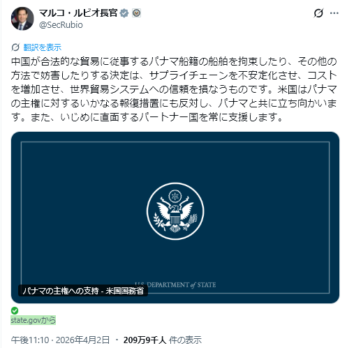 「中国が合法的な貿易に従事するパナマ船籍の船舶を拘束したり、その他の方法で妨害したりする決定は、サプライチェーンを不安定化させ、コストを上昇させ、世界貿易システムへの信頼を損なう」とルビオ上院議員はソーシャルメディアで述べた。「米国はパナマの主権に対するいかなる報復措置にも反対し、パナマと共に立ち向かう。また、いじめに直面するパートナーを常に支援する」