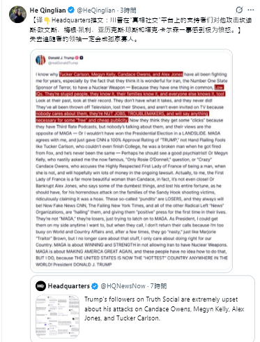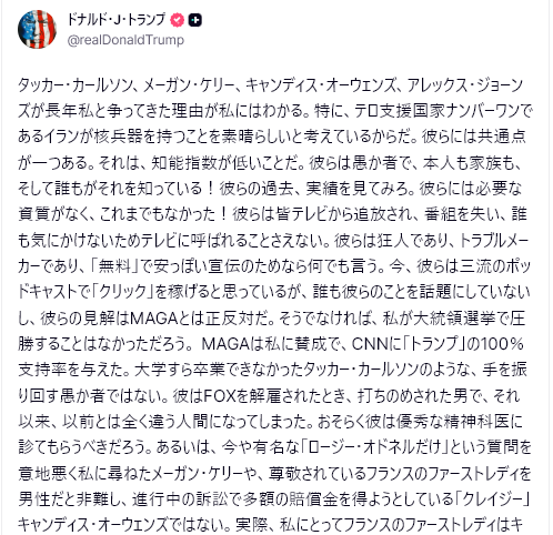 【翻訳👇本部ツイート:トランプはTruth Social上で、支持者たちは、キャンディス・オーウェンズ、メーガン・ケリー、アレックス・ジョーンズ、タッカー・カールソンのトランプへの攻撃に激怒していると】