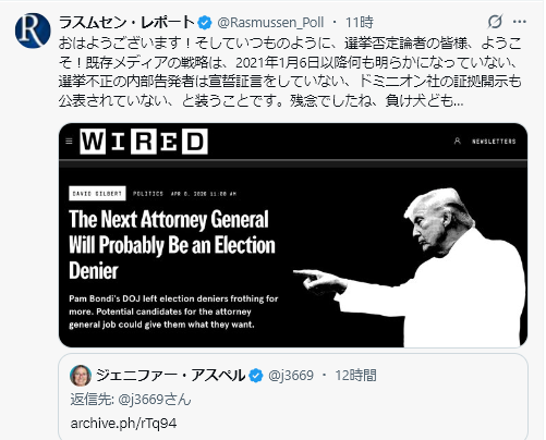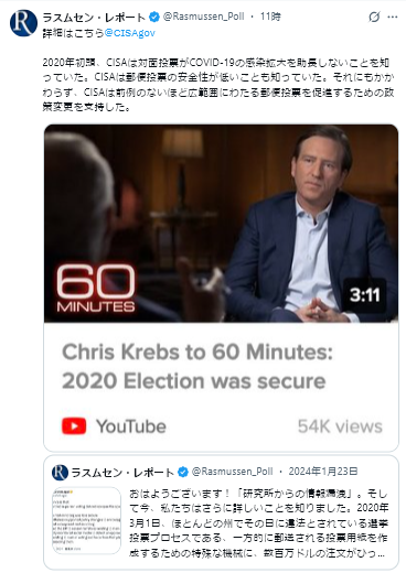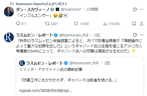 4/9Rasmussen Reports<Iran War Has Boosted Terrorism Risk, Majority Say=イラン戦争はテロのリスクを高めた、と大多数の人が言う>