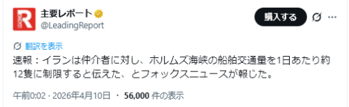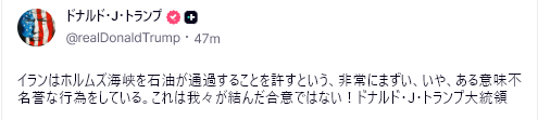 4/7日、トランプ大統領はTruth Socialに、イランの10項目提案は「交渉の実現可能な基盤」と見なされており、両国は主要な争点のほぼすべてについて合意に近づいている。2週間の停戦期間は、合意の詳細を最終決定するために用いられる」と投稿した。イランも2週間の停戦を発表し、ホルムズ海峡を条件付きで開放することを約束した。