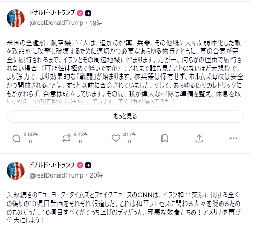 今日の停戦違反だけでも(もう!)、イランが我々の脅威を真剣に受け止めていないことは明らかだ。彼らが提示した和平案を見ても、イランは依然として本気ではないことがわかる。我々は勝利を宣言して帰るわけにはいかない。だが、一夜にして彼らの文明を終わらせることもできない。