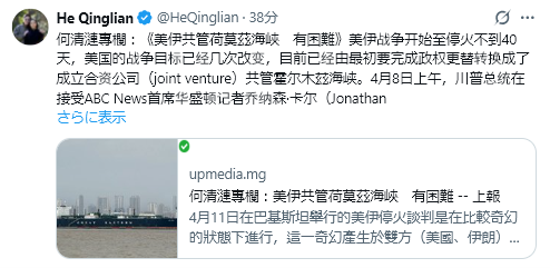 何清漣のコラム:「米国とイランによるホルムズ海峡共同管理は困難に直面」 米イラン戦争開戦から40日も経たないうちに、米国の戦争目的は幾度も変更され、当初の政権転覆という目標から、ホルムズ海峡を共同管理する共同事業の設立へとシフトしている。 4/8朝、トランプ大統領はABCニュースのワシントン支局長ジョナサン・カーとのインタビューで次のように述べた…