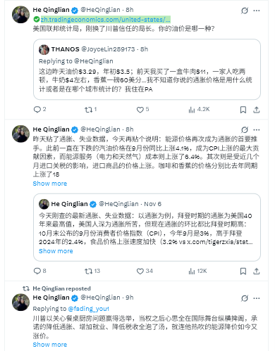 今日、最新のインフレ率と失業率のデータを確認した:インフレ率を例に挙げると、バイデン政権時代のインフレ率は過去40年間で最高を記録し、米国民はインフレに大きく苦しんだ。しかし、前月比のインフレ率はバイデン政権時代よりも高くなっている。10月末に発表された9月の消費者物価指数(CPI)は3%で、バイデン政権が2024年に達成した2.4%を上回っている。食料品価格の上昇率はさらに速くなっている(3.2%対7月の2.9%)。