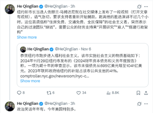 NYの新市長に選出されたゾーラン・マムダニは、ソーシャルメディアに動画を投稿し(記事を開くと動画が見られる)、支持者に対し寄付を再開するよう強く呼びかけた。「無料の住宅、無料の交通機関、そして全市民への社会保障」を掲げるこの著名な社会主義者は、勝利演説からわずか数時間後、突然、政権移行チームが「資金不足」に陥っており、「調査の実施」、「スタッフの雇用」、「行政体制の構築」のために大衆の資金支援が必要だと発言した。