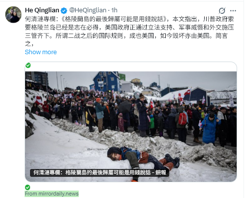 何清漣のコラム:「グリーンランドの最終的な所有権は金銭によって決まるかもしれない」。この記事は、トランプ政権がグリーンランド奪取に固執し、立法支援、軍事抑止、外交圧力という三本柱のアプローチをとっていることを指摘している。いわゆる第二次世界大戦後の国際ルールは米国によって確立されたものだが、今や米国によって破壊されつつある。要するに、グリーンランドに対する米国の要求に直面して、欧州のNATO加盟国は、米国に対抗する決意があるかどうかだけでなく、その能力があるかどうかである。予測される結末は二つある。第一に、NATOの実質的な崩壊:第二に、最終的にEU加盟国が自国の利益を優先し、デンマークが単独でこの問題に対処できない状況で、米国がグリーンランドの帰属問題を解決するために「金銭交渉」に訴えるという事態だ。