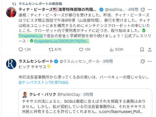 1/19The Gateway Pundit<JUST IN: Political Prisoner Tina Peters Put in Solitary Confinement; Reportedly to be Charged With Felony Assault=速報:政治犯ティナ・ピーターズが独房監禁、重罪暴行で起訴へ>