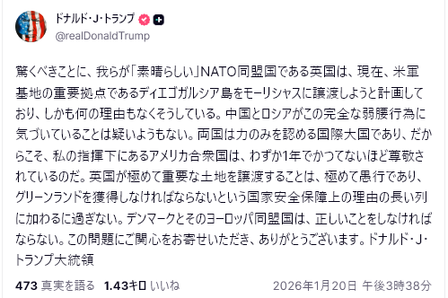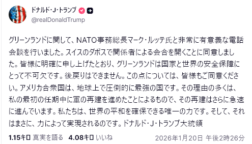 今日のトレンドニュース:トランプがノルウェーのヨナス・ガルストイ首相に宛てた書簡が漏洩した。AIを使って質問してみた(英語):この書簡は、グリーンランドに対する彼の立場と、ノーベル平和賞を受賞できなかったことへの個人的な不満を結びつけている。これはフェイクニュースだろうか? 返ってきた回答は以下の通り(スクリーンショット付き):