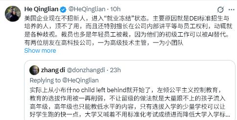 米企業は現在、新規採用を停止し、「雇用凍結」に入っている。主な理由は、DEI基準に従って採用・研修を受けた人材が役立たずで、社内で平等や従業員の権利について語ることに長けており、しばしば様々な差別をする。レイオフの対象も主に若手社員で、彼らの入社レベルの仕事はAIに置き換えられる可能性があるからである。
