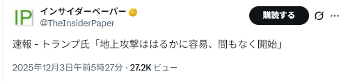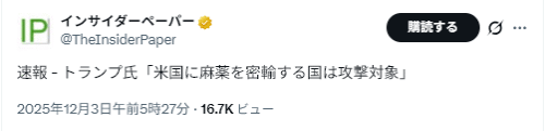河浪氏の記事では、2019年9月25日の円相場は1ドル=107円台とあり、2025年12月3日は155円台と大幅円安になっている。安部氏は円高デフレを止めようとしたのかもしれませんが、今やインフレの時代。早く円の適正相場と言われる130円台にしないと、輸入商品(特に石油・ガス)が高くなり、経常収支に影響を与える。トランプは$安を主張しているのだから、日本国の円買いも認められるのではと思うのですが・・・・。