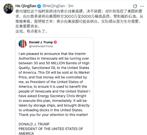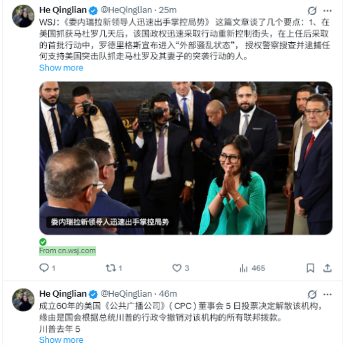 WSJ:「ベネズエラの新指導者、迅速に事態収拾」、この記事では、いくつかの重要な点について論じている:1. マドゥロが米国に拘束されてから数日後、政権は街の統制を取り戻すために迅速に行動を起こした。就任後の最初の行動として、ロドリゲス大統領は「外部騒乱状態」を宣言し、マドゥロ大統領夫妻を拘束した米国による襲撃を支持した者を捜索・逮捕する権限を警察に与えた。