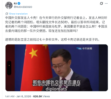 中国外交部報道官、言葉に詰まる!本日の外交部定例記者会見で、林剣報道官は記者からの2つの質問を聞いた後、50秒間も必死に書類を探し、結局的外れな回答に終わった。2つの質問は、「中国は米国にマドゥロの釈放を強く求めているが、米国が釈放しなかったらどうするのか?」「中国が派遣したベネズエラ使節団はまだカラカスにいるのか?」だった。