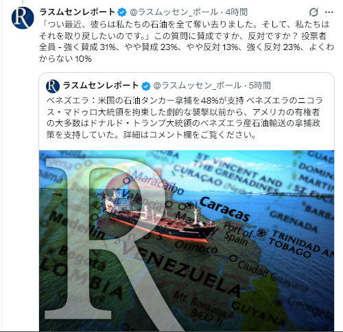 1/6Rasmussen Reports<Venezuela: 48% Approve U.S. Seizing Oil Tankers=ベネズエラ:48%が米国の石油タンカー拿捕を支持>
