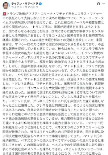 また、マドゥロ氏の後継者として、ノーベル平和賞を受賞した野党指導者のマリア・コリナ・マチャド氏ではなく、マドゥロ派の現副大統領を選んでおり、マドゥロ体制自体は維持している。これは、トランプ大統領が民主化によるベネズエラの体制変更ではなく、治安回復を望んでいるからだろう。