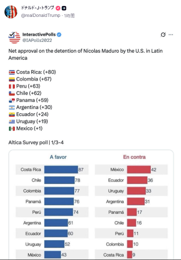 1/3未明、米軍はベネズエラへの攻撃を開始し、マドゥロ大統領夫妻を捕らえ、米国に送致された。これは、トランプが2025年国家安全保障戦略で重点をラテンアメリカに移すとしたことの実施において、初めて達成した大きな成果であり、米国がラテンアメリカにおける政権交代をコントロールする力を持っていることを改めて証明するものである。